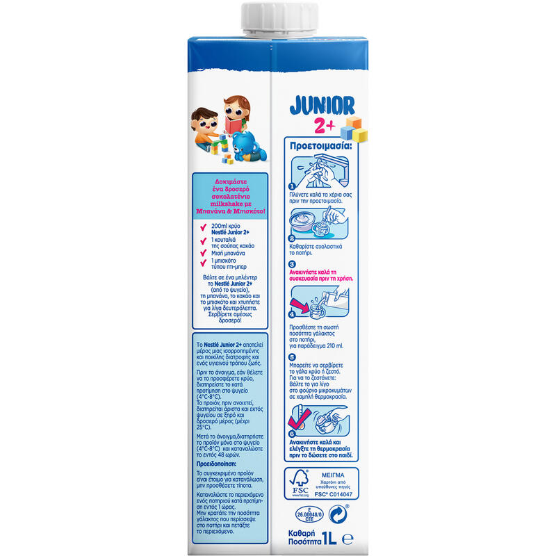 Όλα τα γάλατα δεν είναι ίδια και τα μικρά μας χρειάζονται το δικό τους εμπλουτισμένο ρόφημα γάλακτος! Το Nestlé Junior 2+ που είναι κατάλληλο από τον 2ο χρόνο, είναι εμπλουτισμένο με σίδηρο, ασβέστιο, βιταμίνες και μέταλλα, ενώ λόγω της τεχνολογίας UHT (υψηλής θερμικής επεξεργασίας) δε χρειάζεται αραίωση και διατηρεί σε μέγιστο βαθμό τα θρεπτικά στοιχεία του γάλακτος! Διατήρησε το στο ντουλάπι της κουζίνας σου πριν το άνοιγμα γιατί δεν χρειάζεται ψυγείο πριν το ανοίξεις. Η προηγμένη μέθοδος της υψηλής θερμικής επεξεργασίας εξασφαλίζει ότι το Nestlé Junior 1L είναι απαλλαγμένο από όλους τους παθογόνους μικροοργανισμούς που αναπτύσσονται στο γάλα και το καταστρέφουν, όμως διατηρεί αναλλοίωτα όλα τα θρεπτικά συστατικά του γάλακτος και την υπέροχη γεύση του! Από το 2ο έτος, το παιδάκι σου ξεκινάει την έντονη διανοητική και σωματική ανάπτυξη. Θα σου τραγουδάει, θα σου διηγείται, αλλά θα τρέχει, θα κάνει ποδήλατο και άλλες τόσες δραστηριότητες που θα το αναπτύσσουν! Το Nestlé Junior 2+ είναι ειδικά μελετημένο για να καλύπτει ιδανικά τις αυξημένες διατροφικές ανάγκες των υγιών παιδιών από τον 2ο χρόνο και εσύ είσαι σίγουρη ότι τους παρέχεις όλα τα εφόδια για την ανάπτυξή τους! Και από γεύση… τα παιδιά ξετρελαίνονται!