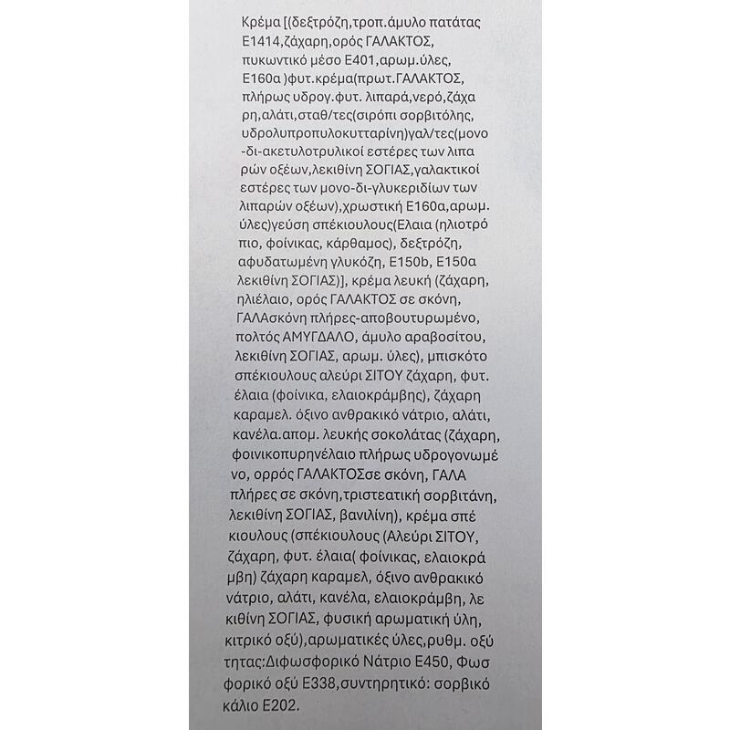 Κρέμα [(δεξτρόζη, τροποιημένο άμυλο πατάτας Ε1414, ζάχαρη, ορός ΓΑΛΑΚΤΟΣ, πυκωντικό μέσο Ε401, αρωματικές ύλες, Ε160α ) φυτική κρέμα (πρωτεΐνη ΓΑΛΑΚΤΟΣ, πλήρως υδρογονωμένα φυτικά λιπαρά, νερό, ζάχαρη, αλάτι, σταθεροποιητές (σιρόπι σορβιτόλης, υδρολυπροπυλοκυτταρίνη) γαλακτωματοποιητές (μονο -δι-ακετυλοτρυλικοί εστέρες των λιπαρών οξέων, λεκιθίνη ΣΟΓΙΑΣ, γαλακτικοί εστέρες των μονο-δι-γλυκεριδίων των λιπαρών οξέων), χρωστική Ε160α, αρωματικές ύλες) γεύση σπέκιουλους (Ελαια (ηλιοτρόπιο, φοίνικας, κάρθαμος), δεξτρόζη, αφυδατωμένη γλυκόζη, Ε150b, Ε150α λεκιθίνη ΣΟΓΙΑΣ)], κρέμα λευκή (ζάχαρη, ηλιέλαιο, ορός ΓΑΛΑΚΤΟΣ σε σκόνη, ΓΑΛΑ σκόνη πλήρες-αποβουτυρωμένο, πολτός ΑΜΥΓΔΑΛΟ, άμυλο αραβοσίτου, λεκιθίνη ΣΟΓΙΑΣ, αρωματικές ύλες), μπισκότο σπέκιουλους αλεύρι ΣΙΤΟΥ ζάχαρη, φυτικά έλαια (φοίνικα, ελαιοκράμβης), ζάχαρη καραμελωμένη, όξινο ανθρακικό νάτριο, αλάτι, κανέλα, απομίμηση λευκής σοκολάτας (ζάχαρη, φοινικοπυρηνέλαιο πλήρως υδρογονωμένο, ορός ΓΑΛΑΚΤΟΣσε σκόνη, ΓΑΛΑ πλήρες σε σκόνη, τριστεατική σορβιτάνη, λεκιθίνη ΣΟΓΙΑΣ, βανιλίνη), κρέμα σπέκιουλους (σπέκιουλους (αλεύρι ΣΙΤΟΥ, ζάχαρη, φυτικά έλαια (φοίνικας, ελαιοκράμβη) ζάχαρη καραμελωμένη, όξινο ανθρακικό νάτριο, αλάτι, κανέλα, ελαιοκράμβη, λεκιθίνη ΣΟΓΙΑΣ, φυσική αρωματική ύλη, κιτρικό οξύ), αρωματικές ύλες, ρυθμιστής οξύτητας: Διφωσφορικό Νάτριο Ε450, φωσφορικό οξύ Ε338, συντηρητικό: σορβικό κάλιο Ε202.