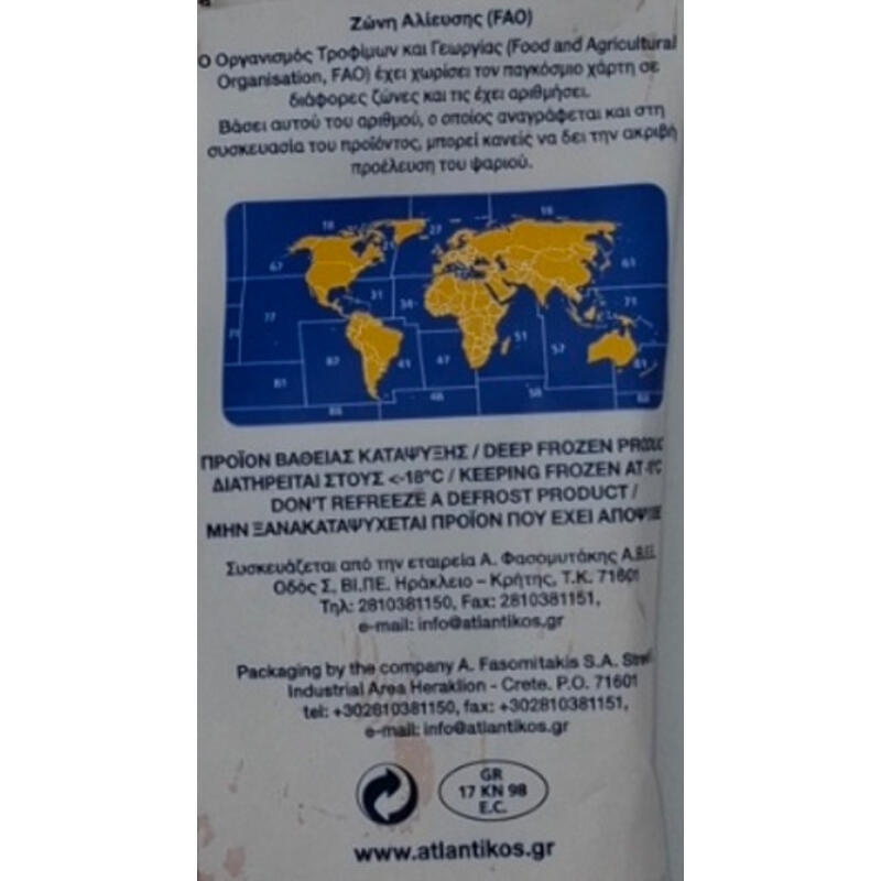"Το Καλαμάρι Ινδίας κομμένο Ατλαντικός είναι καθαρισμένο, κομμένο με το δέρμα για μεγαλύτερη ευκολία. Μαγειρευτά ή τηγανητά τα καλαμάρια αποτελούν μια πλέον εύκολες, υγιεινές και γευστικές προτάσεις που μπορείτε να έχετε στο καθημερινό σας τραπέζι. Αλιευμένο στο FAO 51(Ατλαντικός Νοτιοδυτικός Ωκεανός). Η επιστημονική ονομασία είναι Loligo duvaucelii. Συνίσταται να μαγειρεύεται πριν την κατανάλωση. Διατηρείται στους -18oC. Να μην επαναψύχεται μετά την απόψυξη. Βάρος Τεμαχίου: 500γρ