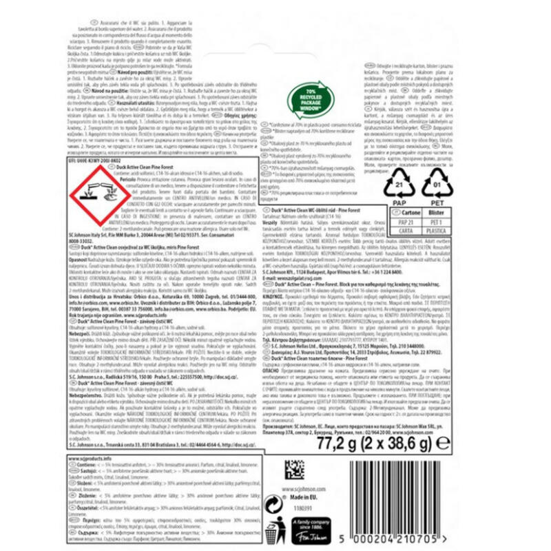 Active Clean Pine Forest Duopack. Block για τον καθαρισμό της λεκάνης της τουαλέτας. O πλούσιος καθαριστικός αφρός και το άρωμα που διαρκεί βοηθούν να διατηρείτε τη φρεσκάδα και την καθαριότητα στη λεκάνη της τουαλέτας σας, κάθε φορά που τραβάτε το καζανάκι.