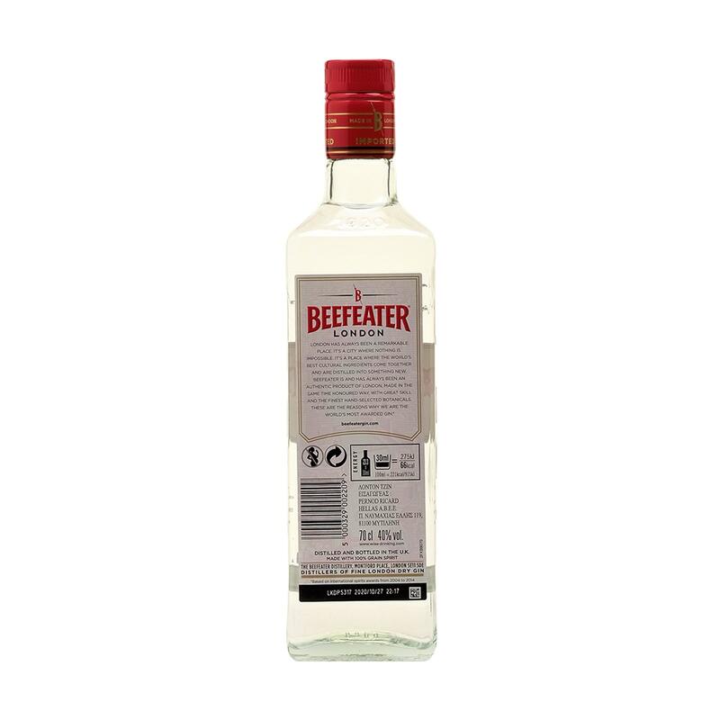 Η ιστορία του Beefeater London Dry Gin ξεκινάει το 1820, αλλά είναι το 1883 που ο δημιουργός του James Burrough –ένας φιλόδοξος φαρμακοποιός με μεγάλο πάθος για το gin, που πειραματίζεται συνεχώς και δημιουργεί νέες πρωτότυπες μίξεις του δίνει το όνομα Beefeater προς τιμή των φρουρών του περίφημου «Tower of London». Το Beefeater είναι το μοναδικό premium gin στον κόσμο που εξακολουθεί να παράγεται στην πόλη του Λονδίνου και αυτό του δίνει τον αυθεντικό, Λονδρέζικο χαρακτήρα του. Η αυθεντική συνταγή του Beefeater έχει παραμείνει αναλλοίωτη από τον 19ο αιώνα, δημιουργώντας ένα premium gin με γεμάτο σώμα και υπέροχα ισορροπημένη γεύση. Η φρουτώδης γεύση του χαρακτηρίζεται από στοιχεία juniper, κίτρου, κόλιανδρου και αγγέλικας. Πρόκειται για το αγαπημένο premium gin διεθνώς αναγνωρισμένων bartenders, και έχει ψηφιστεί ως το Κορυφαίο Gin περισσότερες φορές από κάθε άλλο, τα τελευταία 10 χρόνια. Περιεκτικότητα σε Αλκοόλ: 40%
