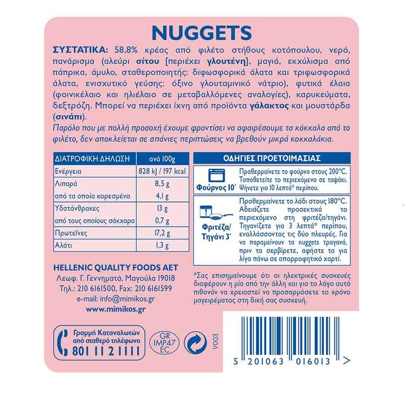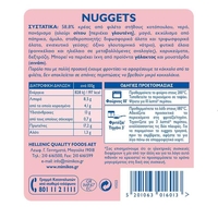 58,8% κρέας από φιλέτο στήθους κοτόπουλου, νερό, πανάρισμα (αλεύρι σίτου [περιέχει γλουτένη], μαγιά, εκχύλισμα από πάπρικα, άμυλο, σταθεροποιητής: διφωσφορικά άλατα και τριφωσφορικά άλατα, ενισχυτικό γεύσης: όξινο γλουταμινικό νάτριο), φυτικά έλαια (φοινικέλαιο και ηλιέλαιο σε μεταβαλλόμενες αναλογίες), καρυκέυματα, δεξτρόζη. Μπορεί να περιέχει ίχνη από προϊόντα γάλακτος και μουστάρδα (σινάπι). Προϊόν προψημένο. Συμβουλές για αλλεργίες: Για τα αλλεργιογόνα, δείτε τα συστατικά με τους έντονους χαρακτήρες.