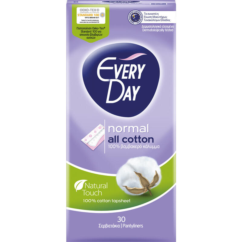 Ανατομικά σχεδιασμένα σερβιετάκια, κανονικού μεγέθους, για καθημερινή προστασία, άνεση και σιγουριά. Τα μόνα με 100% βαμβακερό κάλυμμα για μοναδικά υγιεινή προστασία. Τα πρώτα στην Ευρώπη με τη διεθνή πιστοποίηση Oeko-Tex® Standard 100, για απουσία βλαβερών ουσιών. Σε ατομική συσκευασία για υγιεινή προστασία και διακριτικότητα στη μεταφορά. Τα πρώτα που συνέστησε η Ένωση Μαιευτήρων Γυναικολόγων Ελλάδος. Δερματολογικά ελεγμένα. Παράγονται στην Ελλάδα. Σε συσκευασία 30 τεμαχίων.