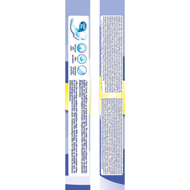 Μεγάλου μήκους λεπτές σερβιέτες, με φτερά προστασίας. Με υγιεινό υφασμάτινο κάλυμμα που περιέχει βαμβάκι και επιτρέπει στο δέρμα να αναπνέει. Με την επαναστατική τεχνολογία Center Plus, με διευρυμένο πυρήνα, που εξασφαλίζει έως και 30% μεγαλύτερη απορροφητική επιφάνεια στο κέντρο της σερβιέτας, σε σχέση με άλλες λεπτές σερβιέτες, για απίστευτη προστασία από διαρροές, εκεί που χρειάζεται περισσότερο. Οι πρώτες στην Ευρώπη με τη διεθνή πιστοποίηση Oeko-Tex® Standard 100, για απουσία βλαβερών ουσιών. Οι πρώτες που συνέστησε η Ένωση Μαιευτήρων Γυναικολόγων Ελλάδος. Δερματολογικά ελεγμένες. Παράγονται στην Ελλάδα. Σε οικονομική συσκευασία 18 τεμαχίων.