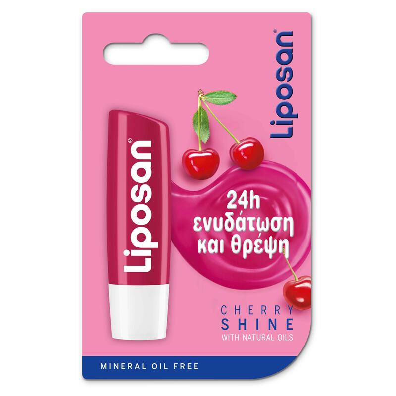Το Liposan Fruity Shine Κεράσι ενισχύει τα χείλη με ένα απαλό κόκκινο χρώμα ώριμου κερασιού, με ιριδίζοντα σωματίδια, που αφήνει ένα απαλό, λαμπερό αποτέλεσμα.