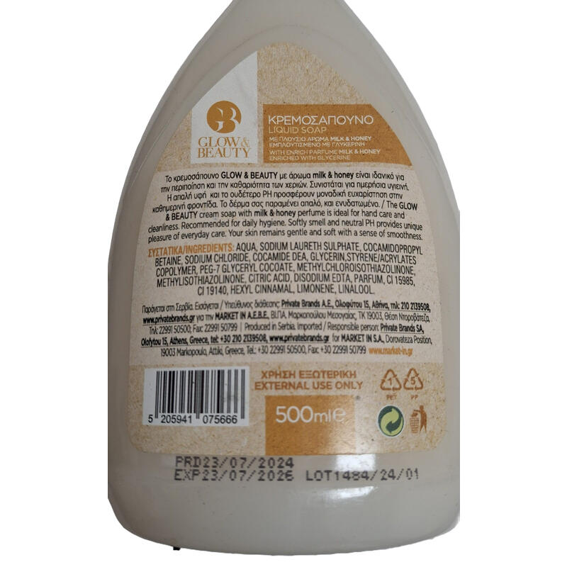 GLOW & BEAUTY κρεμοσάπουνο milk & honey 500ml