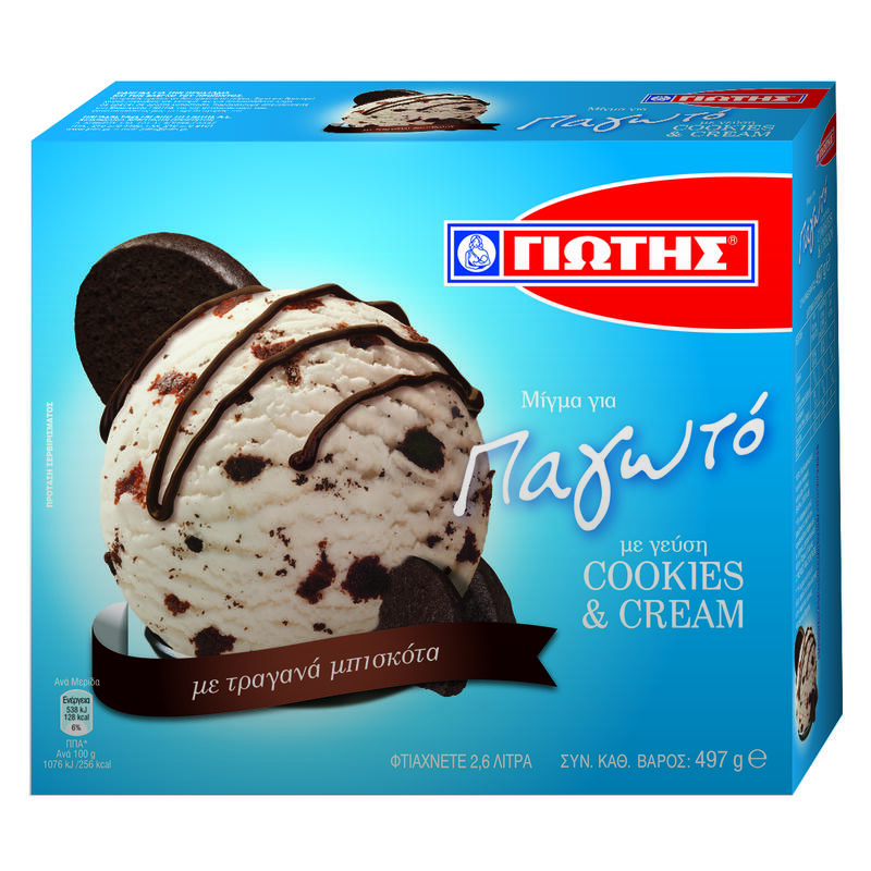 ΜΙΓΜΑ ΓΙΑ ΠΑΓΩΤΟ ΜΕ ΓΕΥΣΗ COOKIES & CREAM: Ζαχαρη, Δεξτρόζη, Γάλα πλήρες σε σκόνη, Στερεά αμυλοσιροπίου Φυτικά έλαια πλήρως υδρογονωμένα (φοινικέλαιο, καρυδέλαιο, φοινικοπυρηνελαιο), Γαλακτωματοποιητές: μονο- και διγλυκερίδια λιπαρών οξέων, οξικοί εστέρες των μονο-και διγλυκεριδίων των λιπαρών οξέων, εστέρες του μονο -και διακετυλο τρυγικού οξέος με μόνο- και διγλυκερίδια των λιπαρων οξέων, Πρωτεϊνες γάλακτος, Σταθεροποιητές: άλευρα κόκκων γκουάρ και κόκκων χαρουπιών, καραγενάνη, καρβοξυ-μέθυλο -κυτταρίνη, όξινο φωσφορικό κάλιο, Μαλτοδεξτρίνη, αρωματικές ύλες, Χρωστικές: εναμμώνιο καραμελόχρωμα, β-καροτένιο, Αντιοξειδωτικό: εκχύλισμα πλούσιο σε τοκοφερόλες σόγιας.ΜΠΙΣΚΟΤΑ: Άλευρι σίτου, ζάχαρη, Φυτικά έλαια και μερικώς υδρογονωμένα φυτικά έλαια (φοινικέλαιο, φοινικοπυρηνέλαιο, κραμβέλαιο, καρυδέλαιο, σογιέλαιο, ηλιέλαιο, σε μεταβαλλόμενες αναλογίες), Αμυλοσιρόπι, κακάο αποβουτυρωμένο (10-12% λιπαρά), κακαόμαζα, αλάτι, Διογκωτικά: διτανθρακικό αμμώνιο, διττανθρακικό νάτριο, Αρωματικές ύλες.ΓΛΑΣΟ ΜΕ ΓΕΥΣΗ ΒΑΝΙΛΙΑ: Ζάχαρη, Φυτικα έλαια (βαμβακέλαιο, φοινικέλαιο), Γάλα πλήρες σε σκόνη, ορρός γάλακτος σε σκόνη, Γαλακτωματοποιητές: μονο- και διγλυκερίδια λιπαρών οξέων, λεκιθίνη σόγιας, αρωματική ύλη: βανιλινη.ΣΙΡΟΠΙ ΓΙΑ ΠΑΓΩΤΟ: αμυλοσιρόπι, χρωστικές: β-καροτένιο.ΜΠΙΣΚΟΤΑ: 30% επι της τελικής συσκευασίας προιόντος.