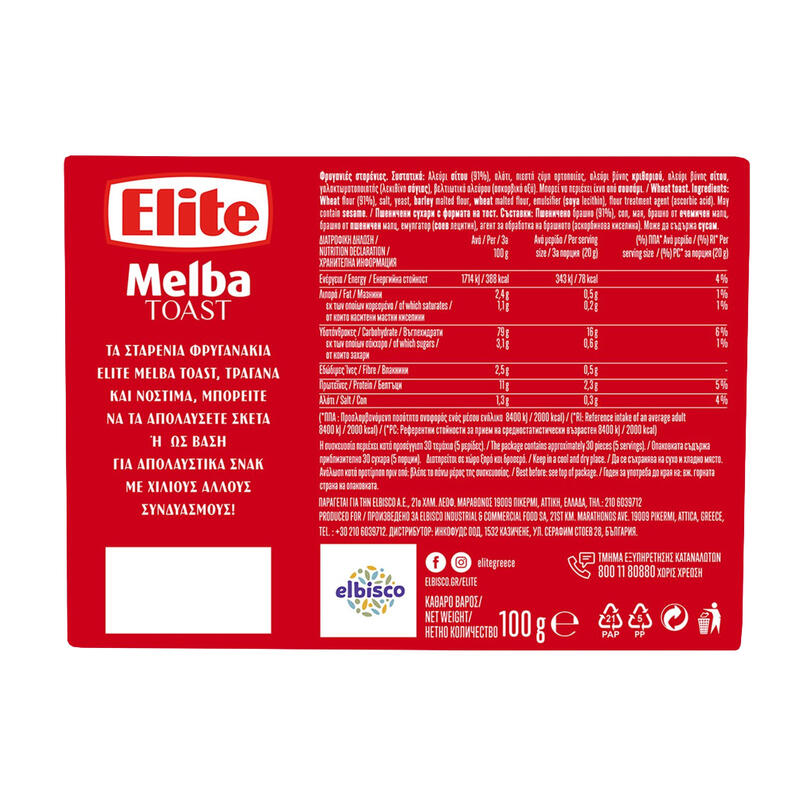 ELITE Melba Toast Φρυγανάκια Σταρένια Vegan 100g