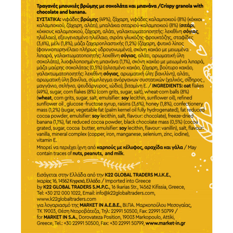 Νιφάδες βρώμης (49%), ζάχαρη, νιφάδες καλαμποκιού (8%) (κόκκοι καλαμποκιού, ζάχαρη, αλάτι), μπαλάκια σιταριού-καλαμποκιού (8%) (σιτάρι, κόκκους καλαμποκιού, ζάχαρη, αλάτι, γαλακτωματοποιητής: λεκιθίνη σόγιας, ηλιέλαιο), εξευγενισμένο ηλιέλαιο, σιρόπι γλυκόζης-φρουκτόζης, σταφίδες (3,6%), μέλι (1,8%), μάζα ζαχαροπλαστικής (1,2%) (ζάχαρη, φυτικό λίπος (φοινικοπυρηνέλαιο πλήρως υδρογονωμένο), σκόνη κακάο με μειωμένα λιπαρά, γαλακτωματοποιητής: λεκιθίνη σόγιας, αλάτι, αρωματική ύλη σοκολάτα), λυοφιλοποιημένη μπανάνα (1,1%), σκόνη κακάο με μειωμένα λιπαρά, μάζα μαύρης σοκολάτας (0,5%) (αλεσμένο κακάο, ζάχαρη, βούτυρο κακάο, γαλακτωματοποιητής: λεκιθίνη σόγιας, αρωματική ύλη: βανιλίνη), αλάτι, αρωματική ύλη βανίλια, σύμπλεγμα ανόργανων συστατικών (χαλκός, σίδηρος , μαγγάνιο, σελήνιο, ψευδάργυρος, ιώδιο), βιταμίνη Ε. Ingredients: oat flakes (49%), sugar, corn flakes (8%) (corn grits, sugar, salt), wheat-corn balls (8%) (wheat, corn grits, sugar, salt, emulsifier: soy lecithin, sunflower oil), refined sunflower oil , glucose -fructose syrup, raisins (3,6%), honey (1,8%), confectionery mass (1,2%) (sugar, vegetable fat (рalm kernel oil fully hydrogenated), fat reduced cocoa powder, emulsifier: soy lecithin, salt, flavour: chocolate), freeze-dried banana (1,1%), fat reduced cocoa powder, black chocolate mass (0,5%) (cocoa grated, sugar, cocoa butter, emulsifier: soy lecithin, flavour: vanillin), salt, flavour: vanilla, mineral complex (copper, iron, manganese, selenium, zinc, iodine), vitamin E.