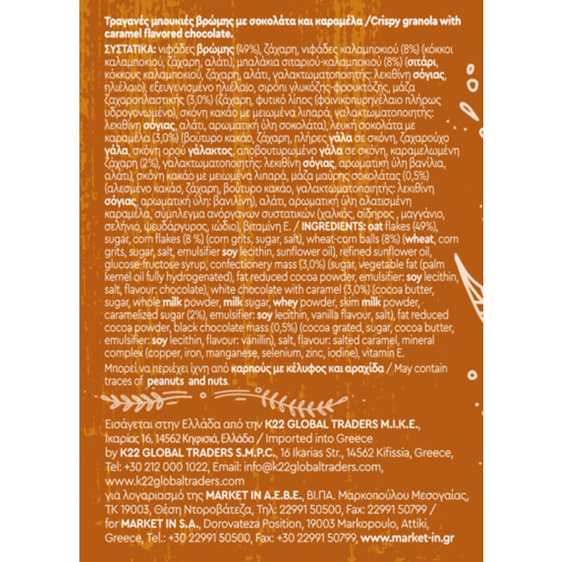 Νιφάδες βρώμης (49%), ζάχαρη, νιφάδες καλαμποκιού (8%) (κόκκοι καλαμποκιού, ζάχαρη, αλάτι), μπαλάκια σιταριού-καλαμποκιού (8%) (σιτάρι, κόκκους καλαμποκιού, ζάχαρη, αλάτι, γαλακτωματοποιητής: λεκιθίνη σόγιας, ηλιέλαιο), εξευγενισμένο ηλιέλαιο, σιρόπι γλυκόζης-φρουκτόζης, μάζα ζαχαροπλαστικής (3,0%) (ζάχαρη, φυτικό λίπος (φοινικοπυρηνέλαιο πλήρως υδρογονωμένο), σκόνη κακάο με μειωμένα λιπαρά, γαλακτωματοποιητής: λεκιθίνη σόγιας, αλάτι, αρωματική ύλη σοκολάτα), λευκή σοκολάτα με καραμέλα (3,0%) (βούτυρο κακάο , ζάχαρη, πλήρες γάλα σε σκόνη, ζαχαρούχο γάλα, σκόνη ορού γάλακτος, αποβουτυρωμένο γάλα σε σκόνη, καραμελωμένη ζάχαρη (2%), γαλακτωματοποιητής: λεκιθίνη σόγιας, αρωματική ύλη βανίλια, αλάτι), σκόνη κακάο με μειωμένα λιπαρά, μάζα μαύρης σοκολάτας (0,5%) (αλεσμένο κακάο, ζάχαρη, βούτυρο κακάο, γαλακτωματοποιητής: λεκιθίνη σόγιας, αρωματική ύλη: βανιλίνη), αλάτι, αρωματική ύλη βανίλια, σύμπλεγμα ανόργανων συστατικών (χαλκός, σίδηρος , μαγγάνιο, σελήνιο, ψευδάργυρος, ιώδιο), βιταμίνη Ε. Ingredients: oat flakes (49%), sugar, corn flakes (8 %) (corn grits, sugar, salt),
