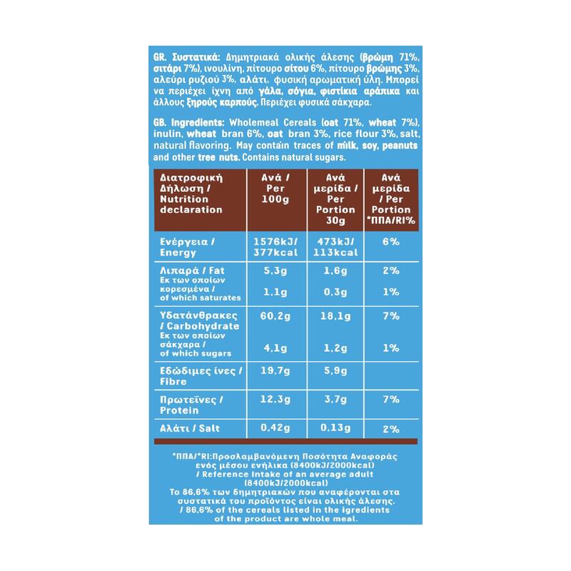 Δημητριακά ολικής άλεσης (αλεύρι ΒΡΩΜΗΣ (63%), ΣΙΤΑΡΙ (6%)), ζάχαρη, νιφάδες ΒΡΩΜΗΣ (5%), αλεύρι ρυζιού (3%), πίτουρο ΒΡΩΜΗΣ (3%), αλάτι, αντιοξειδωτικά (εκχύλισμα τοκοφερολών). Μπορεί να περιέχει ίχνη από ΣΟΓΙΑ, ΦΙΣΤΙΚΙΑ ΑΡΑΠΙΚΑ και άλλους ΞΗΡΟΥΣ ΚΑΡΠΟΥΣ.