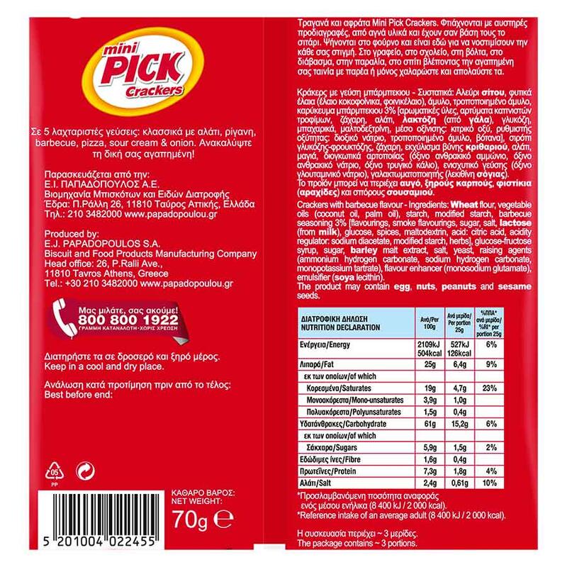 Αλεύρι σίτου, φυτικά έλαια (έλαιο κοκοφοίνικα, φοινικέλαιο), άμυλο, τροποποιημένο άμυλο, καρύκευμα μπάρμπεκιου 4% [αρωματικές ύλες, αρτύματα καπνιστών τροφίμων, ζάχαρη, αλάτι, λακτόζη (από γάλα), γλυκόζη, μπαχαρικά, μαλτοδεξτρίνη, μέσο οξίνισης: κιτρικό οξύ, ρυθμιστής οξύτητας: διοξικό νάτριο, τροποποιημένο άμυλο, βότανα], σιρόπι γλυκόζης-φρουκτόζης, ζάχαρη, εκχύλισμα βύνης κριθαριού, αλάτι, μαγιά, διογκωτικά αρτοποιίας (όξινο ανθρακικό αμμώνιο, όξινο ανθρακικό νάτριο, όξινο τρυγικό κάλιο), ενισχυτικό γεύσης (όξινο γλουταμινικό νάτριο), γαλακτωματοποιητής (λεκιθίνη σόγιας).