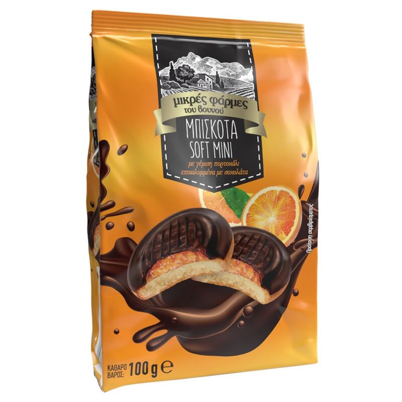 ΜΙΚΡΕΣ ΦΑΡΜΕΣ ΤΟΥ ΒΟΥΝΟΥ Μπισκότα Soft Mini με γέμιση πορτοκάλι επικαλυμμένα με σοκολάτα 100γρ