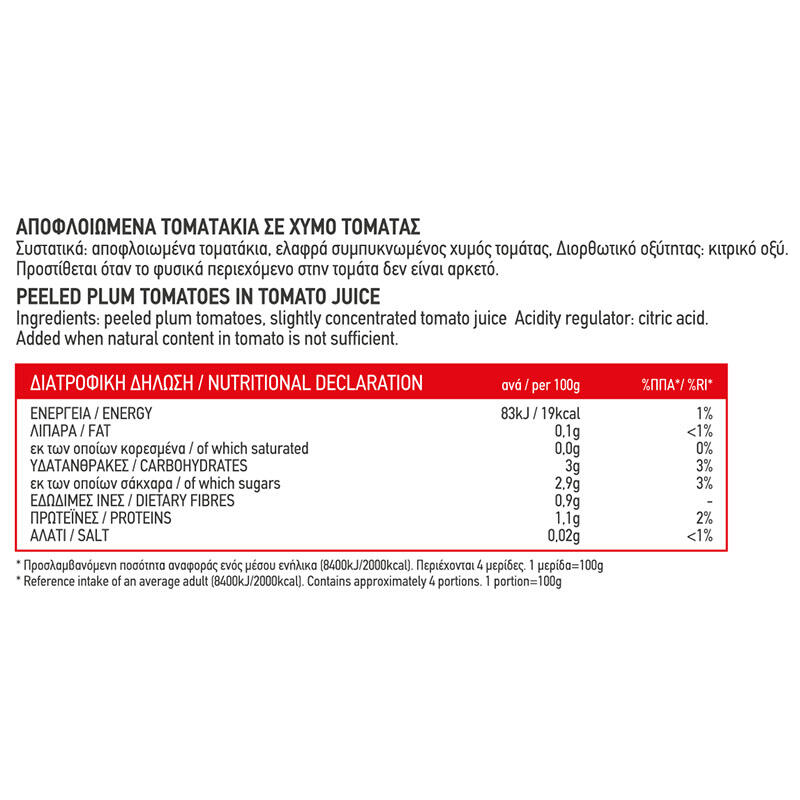 Τομάτες Ολόκληρες Αποφλοιωμένες, σε χυμό τομάτας, σε μεταλλική συσκευασία 400g, με εύκολο άνοιγμα.