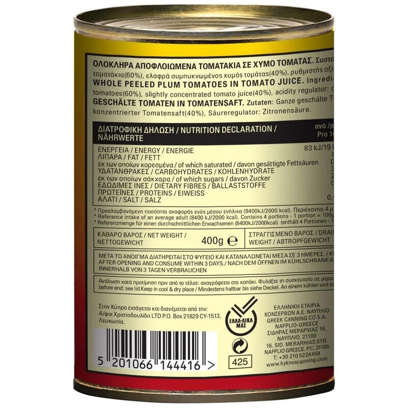 Τοματάκια αποφλοιωμένα ολόκληρα, σε χυμό τομάτας, σε μεταλλική συσκευασία 400g, με εύκολο άνοιγμα. Ιδρύθηκε το 1915, ο ΚΥΚΝΟΣ είναι μια οικογενειακή επιχείρηση, που φημίζεται για τα κονσερβοποιημένα προϊόντα ντομάτας της. Επιλέγει και συσκευάζει ντομάτες που καλλιεργούνται στην περιοχή της Πελοποννήσου κάτω από αυστηρές προδιαγραφές ποιότητας.