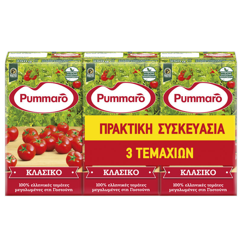 Το Pummaro διάλεξε 100% Ελληνικές τομάτες χαρίζοντας στο φαγητό σας τη γεύση, και το άρωμα της Ελληνικής τομάτας. Για μακαρονάδες, λαδερά, κοκκινιστά, όσπρια, αλλά και για υπέροχες σάλτσες! Σε τρεις πρακτικές συσκευασίας των 250 g.