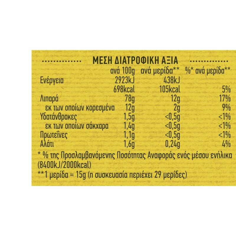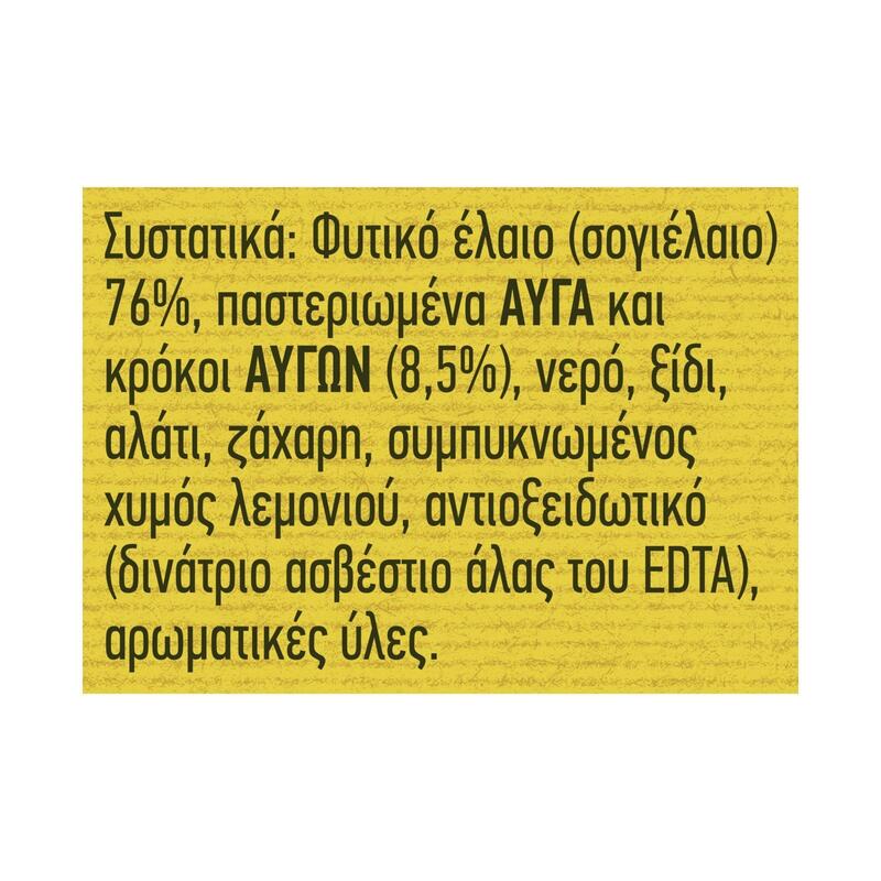 Φυτικό έλαιο (σογιέλαιο) 76%, παστεριωμένα ΑΥΓΑ και κρόκοι ΑΥΓΩΝ ελευθέρας βοσκής(8, 5%), νερό, ξίδι, αλάτι, ζάχαρη, αρωματικές ύλες, συμπυκνωμένος χυμός λεμονιού, αντιοξειδωτικό (δινάτριο ασβέστιο άλας του EDTA).