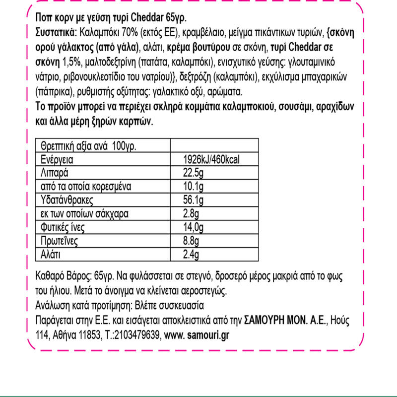 Καλαμπόκι 70% (εκτός ΕΕ), κραμβέλαιο, μείγμα πικάντικων τυριών, {σκόνη ορού γάλακτος (από γάλα), αλάτι, κρέμα βουτύρου σε σκόνη, τυρί Cheddar σε σκόνη 1,5%, μαλτοδεξτρίνη (πατάτα, καλαμπόκι), ενισχυτικό γεύσης: γλουταμινικό νάτριο, ριβονουκλεοτίδιο του νατρίου)}, δεξτρόζη (καλαμπόκι), εκχύλισμα μπαχαρικών (πάπρικα), ρυθμιστής οξύτητας: γαλακτικό οξύ, αρώματα. Το προϊόν μπορεί να περιέχει σκληρά κομμάτια καλαμποκιού, σουσάμι, φιστίκι και άλλα μέρη ξηρών καρπών.