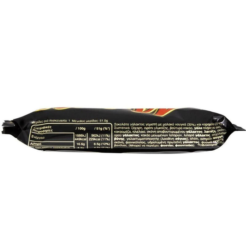 Γεμιστή σοκολάτα με καραμέλα, απαλό νουγκά και επικάλυψη λαχταριστής σοκολάτας γάλακτος.