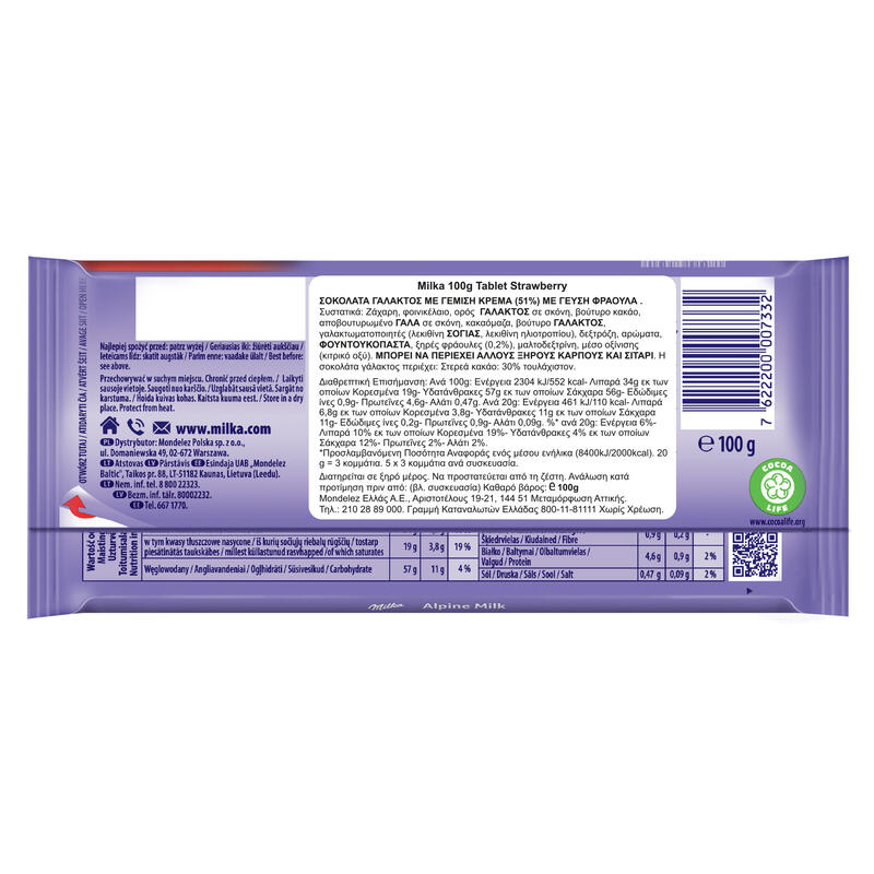 Η μοναδική σοκολατένια γεύση της Milka, που αγαπήθηκε από χιλιάδες καταναλωτές σε όλο τον κόσμο, γεμιστή με κρέμα φράουλα. Σοκολάτα γάλακτος Milka από 100% γάλα Άλπεων με γέμιση με γεύση φράουλα.