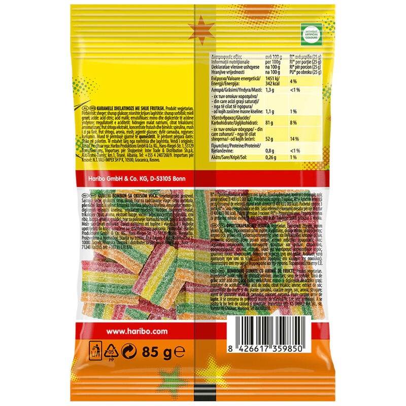 Zάχαρη, σιρόπι γλυκόζης, άμυλο, υγροσκοπικό μέσο: σιρόπι σορβιτόλης, αλεύρι σίτου, μέσο οξίνισης: (κιτρικό οξύ, μηλικό οξύ), γαλακτωματοποιητής: μόνο και διγλυκερίδια λιπαρών οξέων, ρυθμιστές οξύτητας: (όξινο μηλικό νάτριο, κιτρικό ασβέστιο), αρωματικές ύλες, εκχύλισμα σαμπούκου, συμπυκνώματα φρούτων και φυτών: (σπιρουλίνα, φραγκοστάφυλο, αρώνια, σταφύλι), υλικό για γλασάριμα: καρναουβικός κηρός, χρωστική ουσία: κουρκουμίνη.