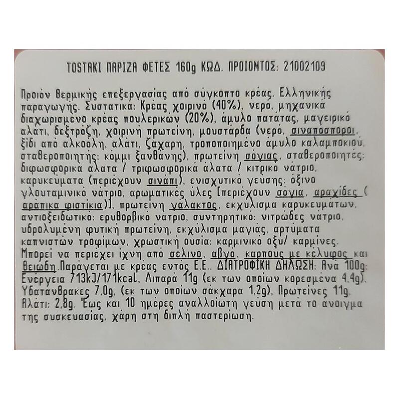 Συστατικά: Κρέας χοιρινό (30%), νερό, μηχανικά διαχωρισμένο κρέας πουλερικών (20%), άμυλο πατάτας, συνδετικός ιστός, μαγειρικό αλάτι, δεξτρόζη, χοιρινή πρωτεΐνη, σάλτσα μουστάρδα (νερό, σιναπόσποροι, ξίδι από αλκοόλη, αλάτι, ζάχαρη, τροποποιημένο άμυλο καλαμποκιού, σταθεροποιητής: κόμμι ξανθάνης), σταθεροποιητές: διφωσφορικά άλατα / τριφωσφορικά άλατα / κιτρικό νάτριο, αρωματικές ύλες [περιέχουν γάλα, σόγια, σέλινο και αραχίδες (αράπικα φιστίκια)], ενισχυτικό γεύσης: όξινο γλουταμινικό νάτριο, καρυκεύματα (περιέχουν σινάπι), πρωτεΐνη γάλακτος, αντιοξειδωτικό: ερυθορβικό νάτριο, πρωτεΐνη σόγιας, συντηρητικό: νιτρώδες νάτριο, αρτύματα καπνιστών τροφίμων, υδρολυμένη φυτική πρωτεΐνη, εκχύλισμα μαγιάς, χρωστική ουσία: κοχενίλη. Μπορεί να περιέχει ίχνη από αβγό, καρπούς με κέλυφος και θειώδη.