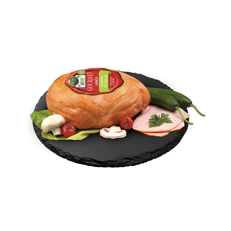 Εκλεκτό ατόφιο φιλέτο γαλοπούλας, μαρινάρεται σε εξαιρετικό παρθένο ελαιόλαδο και συνδυάζεται αρμονικά με εκλεκτά μυρωδικά, απογειώνοντας τη γεύση! Σιγοψήνεται στο φούρνο με ελαφρές νότες καπνού, δημιουργώντας μία γευστική ισορροπία και μία μοναδική γαστρονομική απόλαυση!