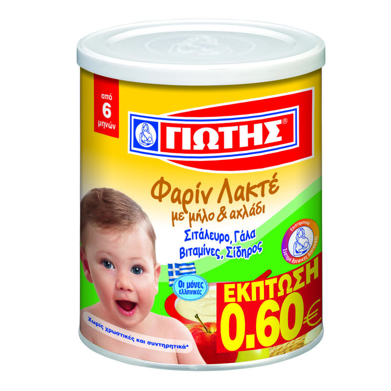 Αλεύρι σίτου (19, 9%), Σακχαρόζη (15, 4%), Πλήρες γάλα σε σκόνη (14, 9%), Άμυλο αραβοσίτου, Αποβουτυρωμένο γάλα σε σκόνη (11, 1%), Ορός γάλακτος σε σκόνη, Φρουκτο- ολιγοσακχαρίτες, Μαλτοδεξτρίνη, Αφυδατωμένο μήλο (1, 8%), Αφυδατωμένο αχλάδι (0, 5%), Ανθρακικό ασβέστιο, Αρωματικές ύλες: βανιλίνη, μήλο, Βιταμίνες (L-ασκορβικό νάτριο, DL-α- οξική τοκοφερόλη, νικοτιναμίδιο, D-παντοθενικό ασβέστιο, ριβοφλαβίνη, υδροχλωρική θειαμίνη, υδροχλωρική πυριδοξίνη, οξική ρετινόλη, φολικό οξύ, D-βιοτίνη, χοληκαλσιφερόλη, κυανοκοβαλαμίνη), Φρουκτόζη, Φουμαρικός σίδηρος, Γλυκόζη. Περιέχει γλουτένη.