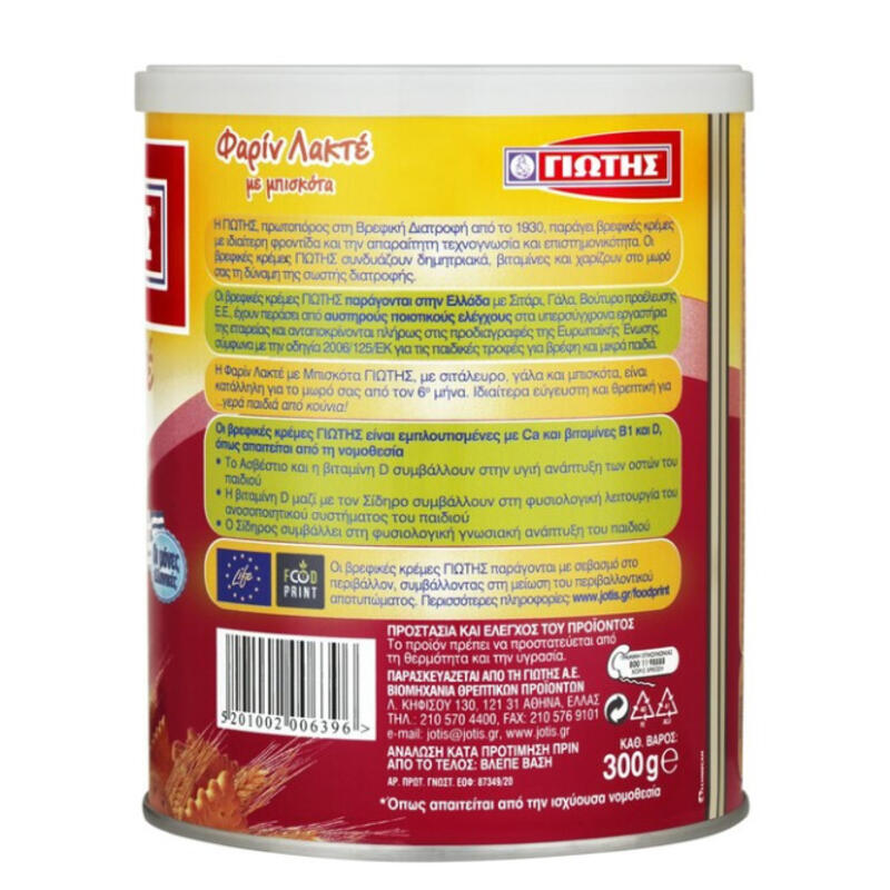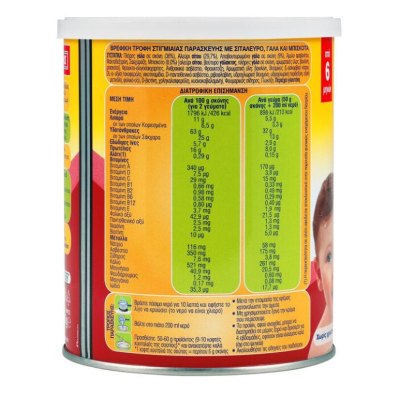 Αλεύρι σίτου (20%), Σακχαρόζη (15, 5%), Πλήρες γάλα σε σκόνη (14, 9%), Άμυλο αραβοσίτου, Αποβουτυρωμένο γάλα σε σκόνη (11, 2%), Ορρός γάλακτος σε σκόνη, Μπισκότο (8%) [αλεύρι σίτου, βούτυρο γάλακτος, πλήρες γάλα σε σκόνη, αρωματικές ύλες: βανιλίνη, μπισκότο], Φρουκτο-ολιγοσακχαρίτες, Ανθρακικό ασβέστιο, Αρωματική ύλη: βανιλίνη, Βιταμίνες (L-ασκορβικό νάτριο, DL-α-οξική τοκοφερόλη, νικοτιναμίδιο, D-παντοθενικό ασβέστιο, ριβοφλαβίνη, υδροχλωρική θειαμίνη, υδροχλωρική πυριδοξίνη, οξική ρετινόλη, φολικό οξύ, D-βιοτίνη, χοληκαλσιφερόλη, κυανοκοβαλαμίνη), Φρουκτόζη, Μαλτοδεξτρίνη, Φουμαρικός σίδηρος, Γλυκόζη, Γλουτένη