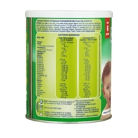 Αλεύρι σίτου, Σακχαρόζη (15, 6%), Πλήρες γάλα σε σκόνη (15%), Άμυλο αραβοσίτου, Αποβουτυρωμένο γάλα σε σκόνη (11, 3%), Ορρός γάλακτος σε σκόνη, φρουτο-ολιγοσακχαρίτες, Αφυδατωμένα φρούτα (1, 1%) : μήλο, αχλάδι, πορτοκάλι, μπανάνα, βερίκοκο, Μαλτοδεξτρίνη, Ανθρακικό ασβέστιο, Πηκτίνη, Αρωματικές ύλες: βανιλίνη, πορτοκάλι, μπανάνα, Βιταμίνες (L-ασκορβικό νάτριο, DL-α-οξική τοκοφερόλη, νικοτιναμίδιο, D-παντοθενικό ασβέστιο, ριβοφλαβίνη, υδροχλωρική θειαμίνη, υδροχλωρική πυριδοξίνη, οξική ρετινόλη, φολικό οξύ, D-βιοτίνη, χοληκαλσιφερόλη, κυανοκοβαλαμίνη), Φρουκτόζη, Φουμαρικός σίδηρος, Γλυκόζη, Λεκιθίνη ηλίανθου. Περιέχει γλουτένη.
