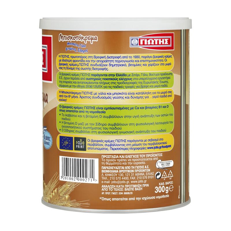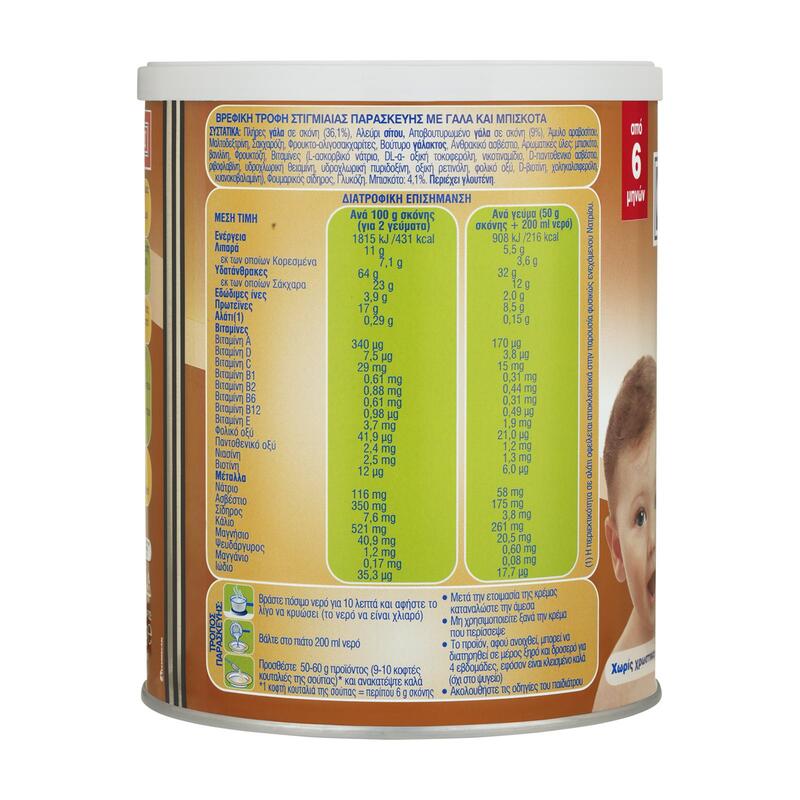 Αλεύρι σίτου, σακχαρόζη (15, 6%), Γάλα πλήρες σε σκόνη (15%), , αμυλο αραβοσίτου, αποβουτυρωμένο γάλα σε σκόνη (11, 3%) ορρός γάλακτος σε σκόνη, Φρουκτο-ολιγοσακχαρίτες, βουτυρο γάλακτος, , Ανθρακικό ασβέστιο, Φυτικό έλαιο (φοινικέλαιο), Αρωματικές ύλες (βανιλινη, μπισκοτο), Μίγμα βιταμινών (L-ασκορβικό νάτριο, DL-α-οξική τοκοφερόλη, νικοτιναμίδιο, D-παντοθενικό ασβέστιο, ριβοφλαβίνη, υδροχλωρική θειαμίνη, υδροχλωρική πυριδοξίνη, οξική ρετινόλη, φυλλικό οξύ, D-βιοτίνη, χοληκαλσιφερόλη, κυανοκοβαλαμίνη), Φρουκτόζη, Μαλτοδεξτρίνη, Φουμαρικός σίδηρος, Γλυκόζη. Μπισκότο: 4, 1%. Περιέχει γλουτένη.
