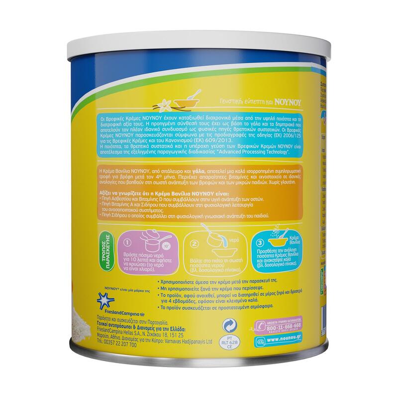 Η Κρέμα Βανίλια ΝΟΥΝΟΥ, από ρυζάλευρο και γάλα, αποτελεί μία καλά ισορροπημένη συμπληρωματική τροφή για βρέφη μετά τον 4ο μήνα. Περιέχει απαραίτητες βιταμίνες και ιχνοστοιχεία σε ιδανικές αναλογίες που βοηθούν στη σωστή ανάπτυξη των βρεφών και των μικρών παιδιών. Χωρίς γλουτένη.