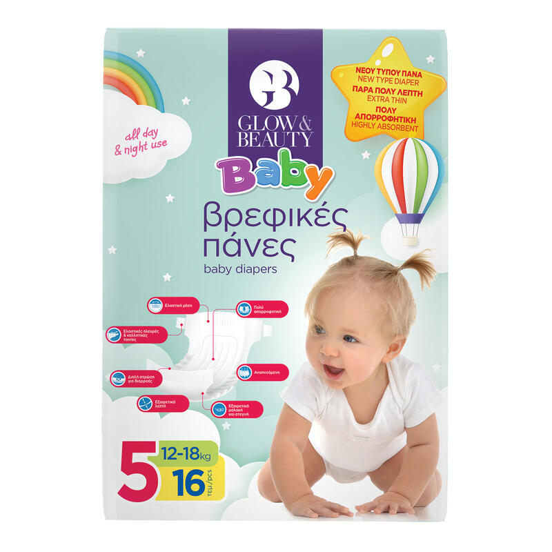 GLOW AND BEAUTY Baby βρεφικές πάνες Ν5 12-18kg 16τμχ